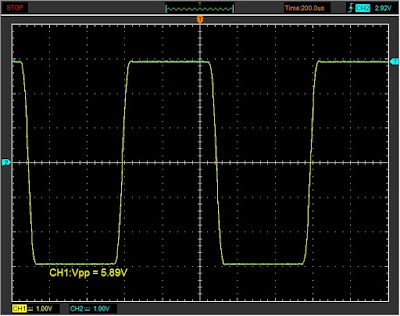 Okay, as usual, let's start with some "microscopic" examination of the analogue electrical output. Here's what a 1kHz 0dBFS square wave looks like through the digital oscilloscope:Already this is looking rather auspicious :-). Peak voltage of ~2.9V, well formed square waves, excellent channel balance. Nice and clean as it should be.