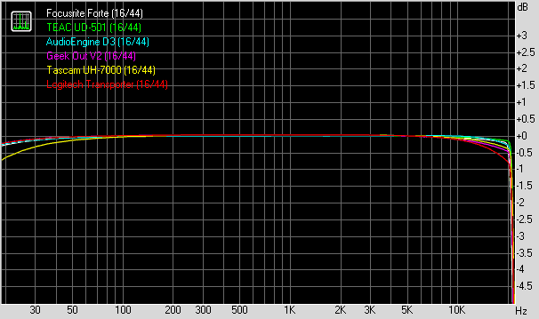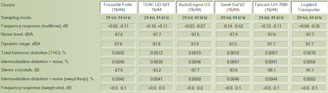 Okay, with an anticipated shift to another measurement ADC, it's expected that the results will not be directly comparable with those obtained using the E-MU 0404USB. Remember, just like different DACs have different ways of filtering, or implement different oversampling characteristics, so too do ADCs differ. Furthermore, there are differences in input impedance; the E-MU 0404USB's line-level input is rated as 1M-ohm, and the Focusrite Forte is rated at 44kohm. This should not be a problem for the Forte as typically line-level outputs have impedance of <1kohm.For an interesting overview of ADC functioning, see this post on "How Analog-to-Digital Converter (ADC) Works".