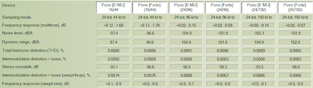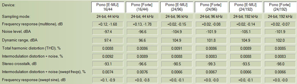 The AudioEngine D3 and Logitech Transporter are not capable of more than 96kHz, so I included the results of the PonoPlayer here. Again, we see slightly better than 18-bit dynamic range. Crosstalk is a little higher, distortion level remains excellent with the Forte.