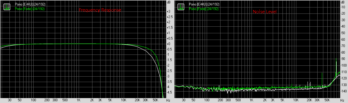 As for the ADC function, I really like how clean the noise floor is! Sure, the noise level is a little higher than the E-MU through parts of the audible spectrum, but I trust that a 3dB difference at -110dB isn't going to upset anyone :-). As you can see, comparative measurements of the same DACs with the Forte vs. E-MU results in good correlation between the devices.