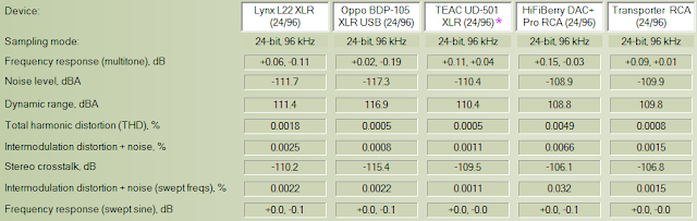 As usual, 16/44 is really straight forward for essentially any reputable DAC. It would truly take a remarkably incompetent design (or purposely "defective by design" like noisy tube output stage) to mess up 16/44 performance these days. Nonetheless, even among the devices here, you see that there are slight differences such as higher THD especially with the Pi3/HiFiBerry DAC+ Pro. I also have the Squeezebox Transporter RCA measurements. The Lynx L22 obviously performs well though you can see the THD is a little higher than the other two XLR devices offered for comparison - the Oppo BDP-105 and TEAC UD-501. Not a difference one would be able to hear though.