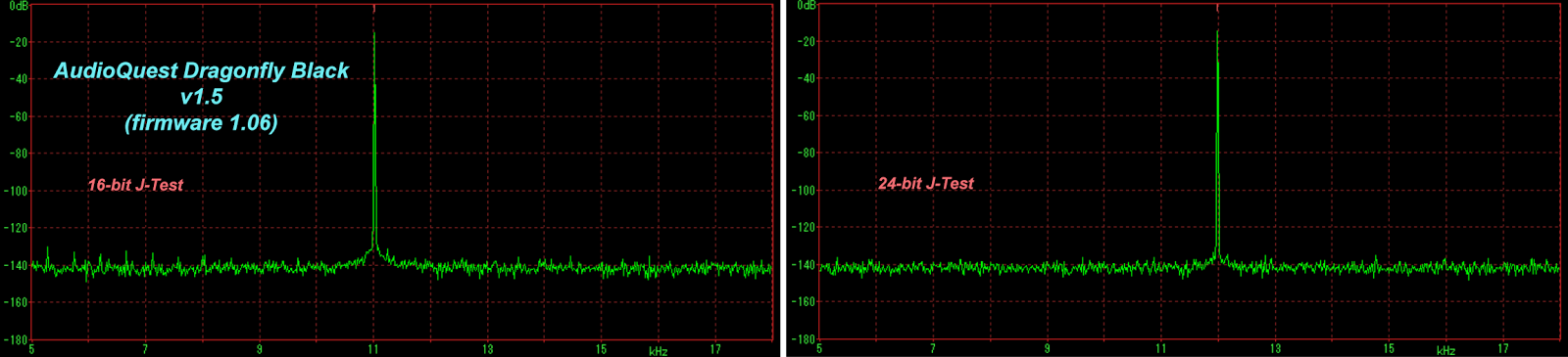 The Dunn J-Test looks good with no unusual sidebands. This is as expected from a modern asynchronous USB device. Notice that because of the Dragonfly's relatively low resolution just clearing the 16-bit noise level, we can't see the 16-bit modulation signal poking through the noise floor as well. Look at the recent SMSL iDEA's 16-bit J-Test for comparison.