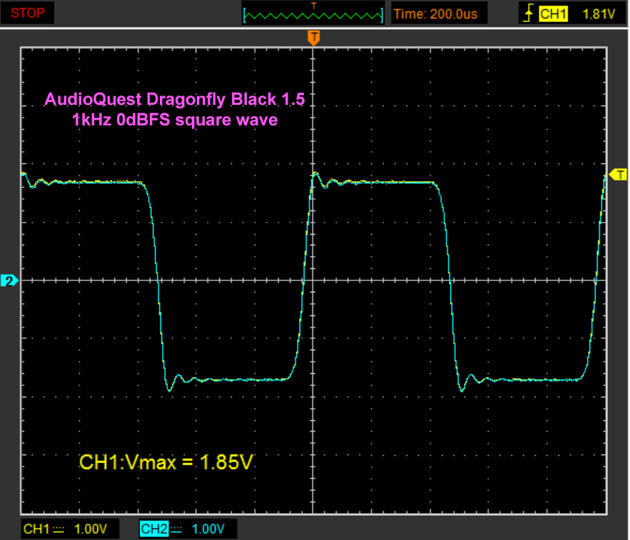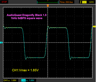 Let's start with the microscopic evaluations... Here's the 1kHz 0dBFS 16/44 square wave as per the digital oscilloscope:That looks good - Vmax of 1.85V or Vrms of 1.3V for this sample. Channel balance is excellent and much better than the Dragonfly v1.2. By the appearance of the post-ringing, the digital antialiasing filter is of the minimum phase variety.