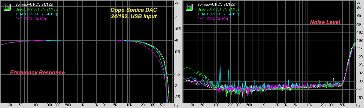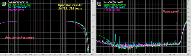 If we're super critical, we can see that the TEAC UD-501 has a couple of noise spikes at 120 and 180Hz. The Oppo BDP-105 is remarkably good except for a little bit more noise below 60Hz compared to the Sonica DAC. Though not clearly demonstrated in the busy noise level graph, the Sonica DAC is remarkably quiet with no evidence of hum at 60Hz. Excellent, and speaks to a very quiet power supply.