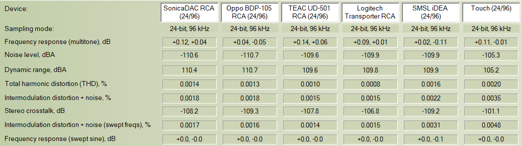 As you can see, we have a good selection of devices here for comparison. There's the Sonica DAC on the far left, then Oppo's BDP-105 fed by USB, TEAC UD-501, Logitech Transporter, the little SMSL iDEA DAC, and finally Logitech's Touch. Even a cursory examination of the data suggests that there's very little difference between the devices at 16/44!