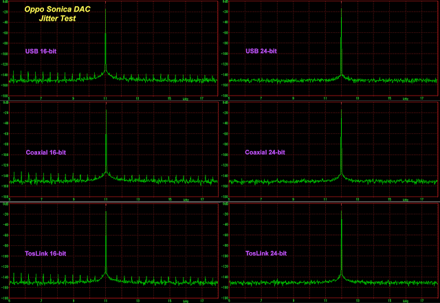 Remember the old firmware had issues as reported in my previous "Preview" post. This has since been fixed. Here's what the 16-bit and 24-bit J-Tests look like with the various inputs:As expected, USB output looks very clean and jitter-free. Using my Surface 3 USB-to-S/PDIF CM6631A converter, likewise, we see that jitter is not an issue at all with coaxial and TosLink inputs. Fantastic reminder that jitter is just not worth really worrying about - not only would it be inaudible with most decent modern equipment, but with a device like the Sonica DAC, it's even objectively essentially non-existent.