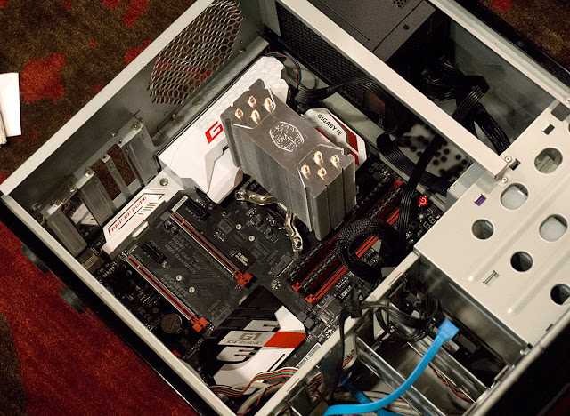 CPU: Intel i5-6500 (~$200)Although I've changed the power supply, the case, and added a bunch of drives - Western Digital Red 6TB and Red 2TB for a total of around 20TB storage for all my data, videos, images, backups and music of course available over my network. The innards look like this picture I took more than a year back with a fan slapped on that CoolerMaster heatsink in a better case: