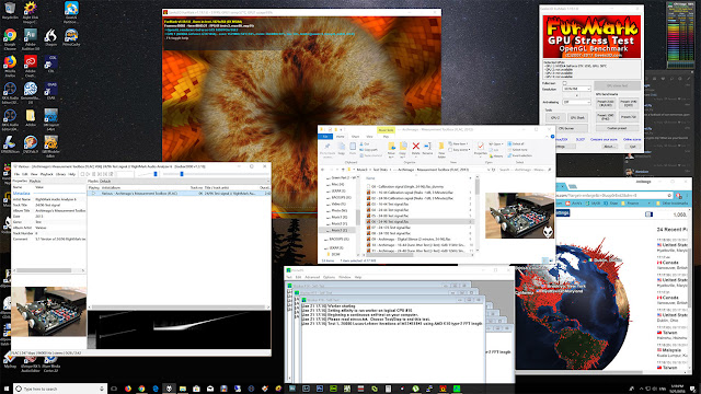 Here's what my desktop looked like when I measured the motherboard output under load! Notice that I'm running all CPU threads at 100% with 64-bit Prime95 (top right CPU load gadget). My web browser is open showing an OpenGL spinning globe, I have FurMark hammering the GPU creating heat. And there are a few other windows open including foobar playing the test tones...