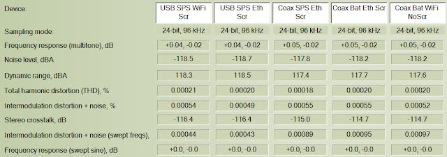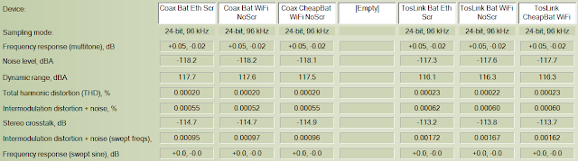 The last 3 columns are using the JustBoom Digi's coaxial S/PDIF. The middle column test is still using the switching power supply while the last 2 tests on the right are with the RavPower battery whether with WiFi or ethernet and LCD screen on or off (disconnected).