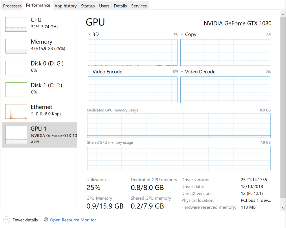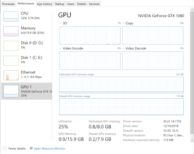 This is the "Performance" tab in Windows 10 Task Manager when playing back 24/96 PCM as DSD512 using "poly-sinc" oversampling and the "AMSDM7 512" modulator. As you can see, about 32% of the CPU and 25% of the GPU were utilized. This is rather in contrast to the much less processor-hungry JRiver 24 which only used 15-25% of the CPU without GPU assistance!