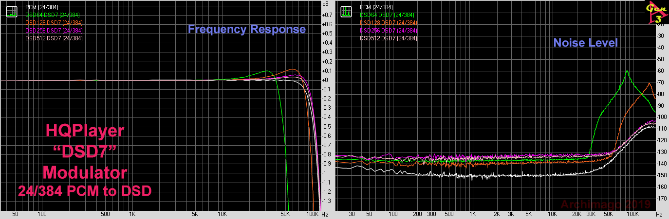 The 7th order "adaptive" SDM. Again, notice the shape of the ultrasonic noise in the DSD64 and DSD128 playback compared to the DSD5 and DSD7 modulators. It looks like an intermediate between DSD5 and DSD7; not as aggressive as DSD7 and the ultrasonic noise with DSD64 peaks around -65dB at 75kHz.