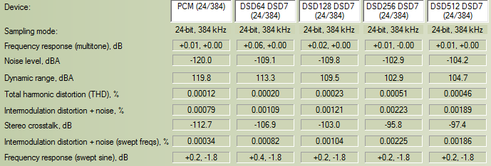 Numerically and on the graphs, we really don't see much different than what was published before with the Oppo UDP-205 and DSD playback. Notice the effect of noise-shaping in DSD64 and DSD128 with noise floor rising up to around -75dBFS up at 80kHz for DSD64. Should not be a problem for decent amps and should not blow tweeters.