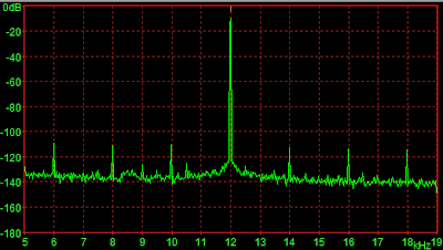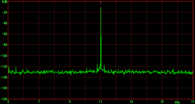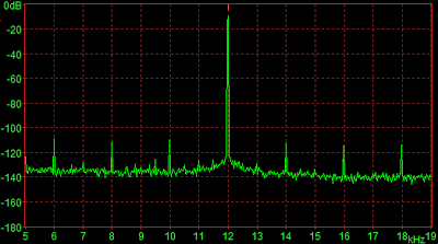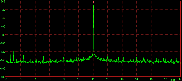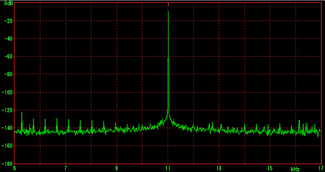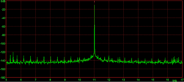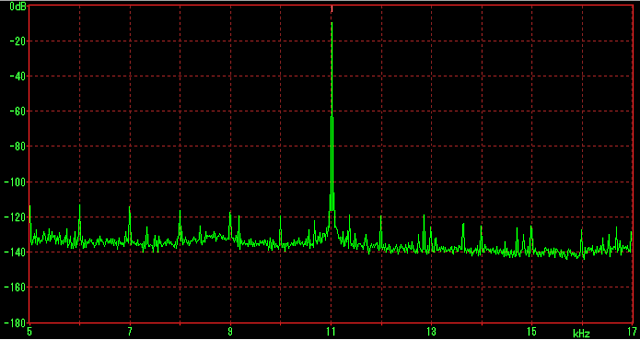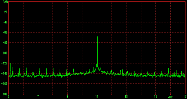 Lets take a look at the adaptive USB jitter spectrum directly from the AUNE X1 (remember, only up to 16 bits, so I'll be using the 16/44 Dunn J-Test signal) [UPDATED April 1, 2013 - SEE BELOW]: