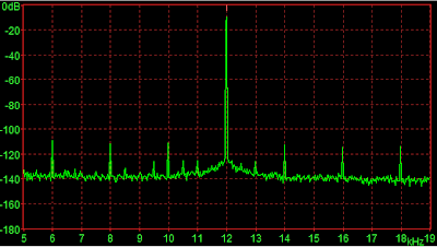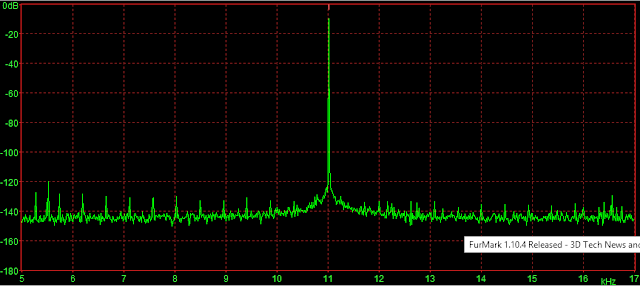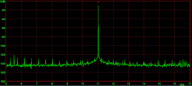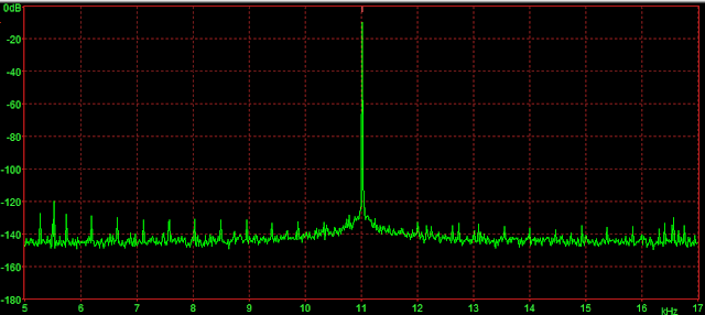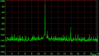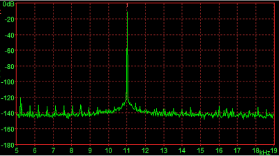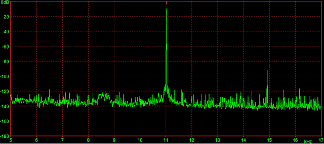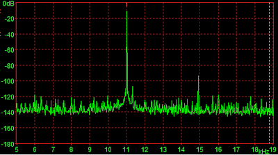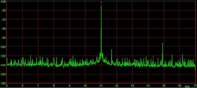 Essentially no difference to the spectrum whether the computer is fully loaded or not! You see a bit of noise showing up between 8-9kHz but it's all very low amplitude (again >100dB below the 11kHz peak).