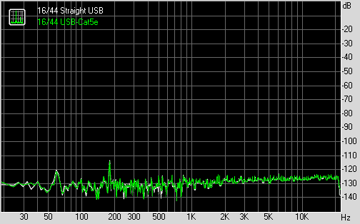 Surprised? As you can see - not much difference at all! If you monitor the realtime FFT for the J-Test, you will see errors "popping up" with the bad cable due to bad data transfer, but in between, the jitter plots are essentially indistinguishable! This is expected... For an asynchronous DAC like the ASUS Essence One, jitter rejection is handled very well by design and there's nothing the passive cable can do about that.