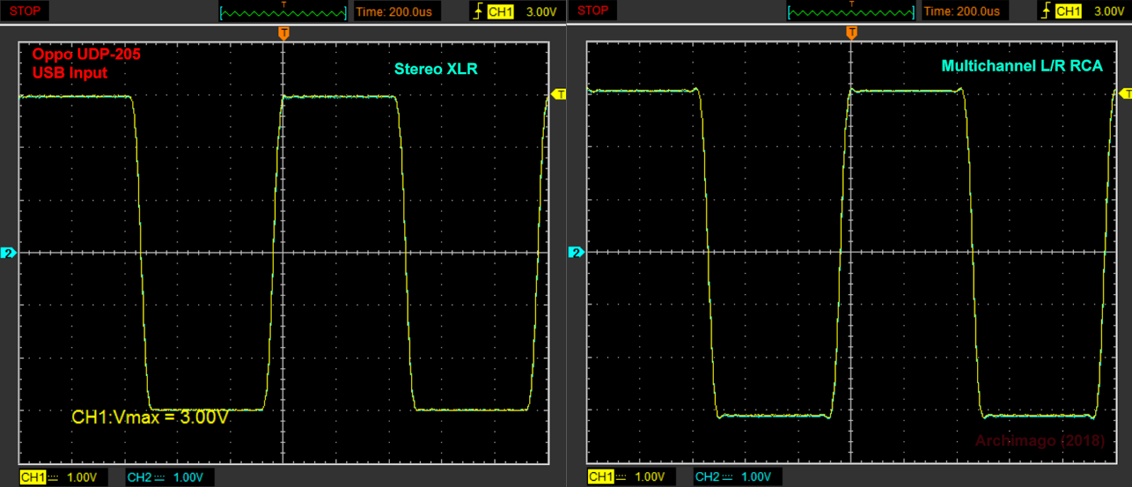On the left are the XLR channels plugged into a XLR --> RCA converter. This won't demonstrate the quality of the signal (we'll directly measure the XLR output resolution next time with RightMark measurements), for now it does demonstrate again the excellent channel balance. On the right is the same signal from the front L/R channels of the 7.1 RCA jacks. Line level and XLR outputs look great overall.