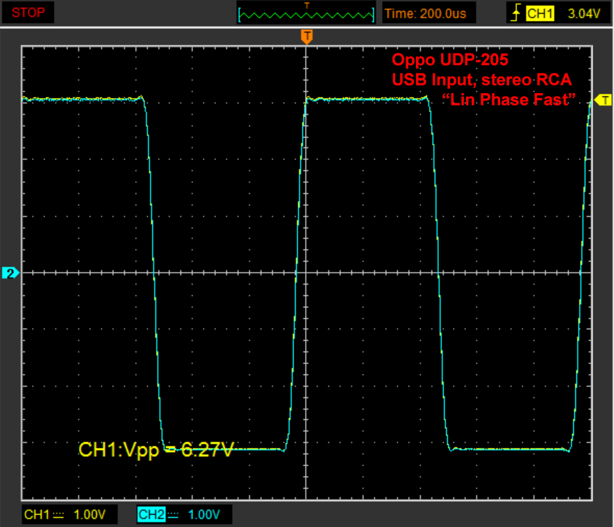 Yeah, that's more like it for an accurate square wave. Looks pretty good. The two channels overlay nicely on each other which is of course what you want to see with precise channel balance. Notice the general absence of pre- or post-ringing. Peak voltage is at 3V or 2.1Vrms for a sine wave.